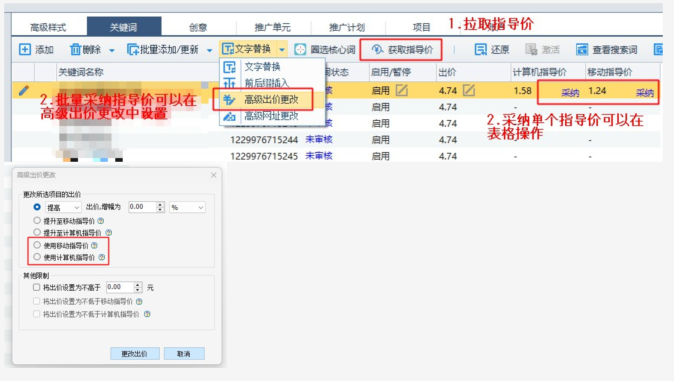 提示:系统会拉取列表选中关键词的指导价,如果采纳单个指导价,可以点击列表中的采纳按钮。批量采纳指导价,可以在高级出价更改中设置,设置入口如下截图。